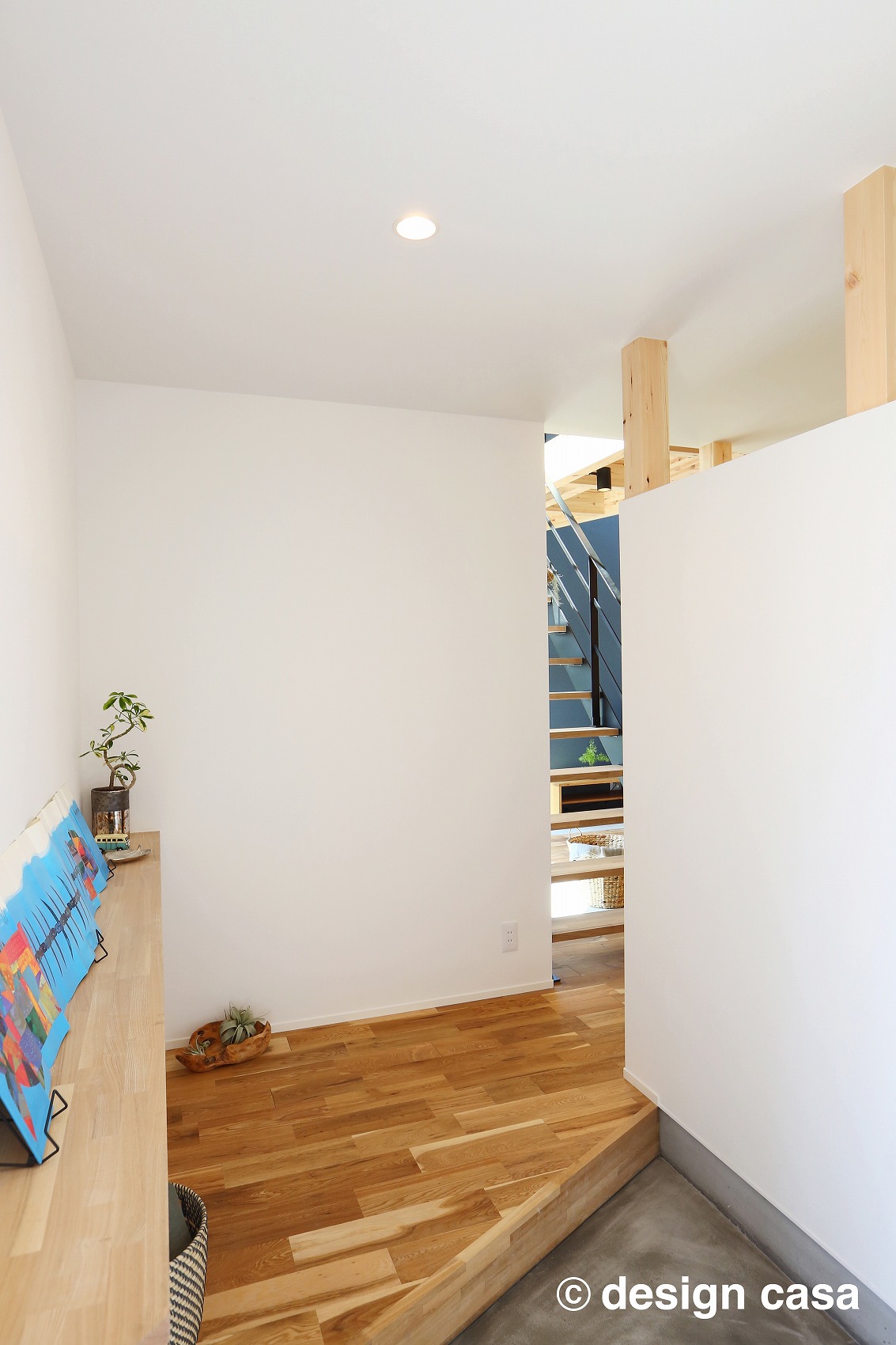 玄関・廊下へ自然光が届き、家の中心が明るく心地よい印象に。閉じすぎず、見せすぎない絶妙なバランスで、家族の気配をやさしくつないでくれます。